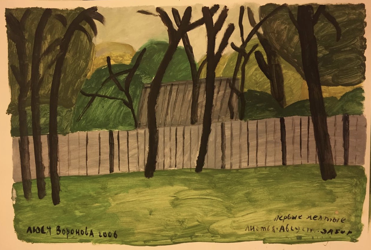 Первые желтые листья, август, забор.